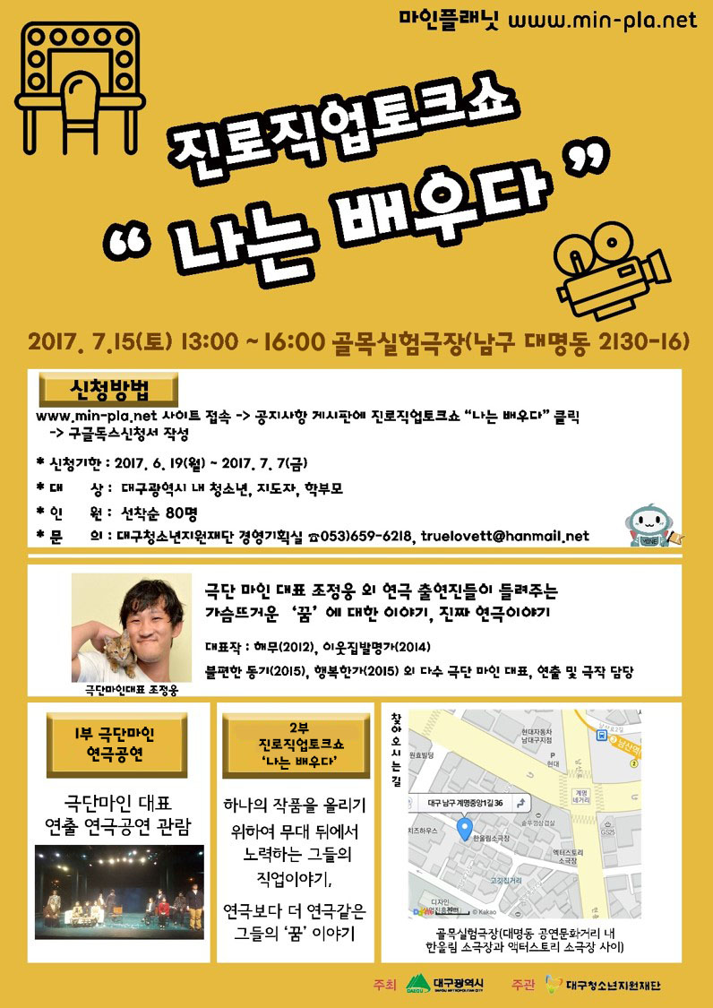 ○ 장 소 : 골목실험극장(대구 남구 계명중앙1길 36) ○ 일 시 : 2017. 7. 15(금) 13:00 ~ 16:00 ○ 내 용 : 진로토크쇼 ‘나는 배우다’개최 - 1부 : 극단마인대표연출 연극공연 관람 - 2부 : 연극인들의 직업이야기, 하나의 작품을 올리기 위해서 보이지 않는 곳에서 노력하는 그들의 이야기, 연극보다 더 연극같은 그들의‘꿈’이야기 ○ 신청문의 : 김유진 ☎053)659-6218